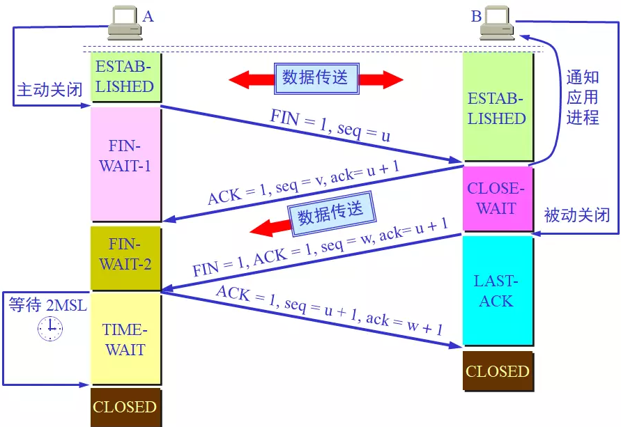 - B收FIN,发ACK,确认序号为收到的序号加1