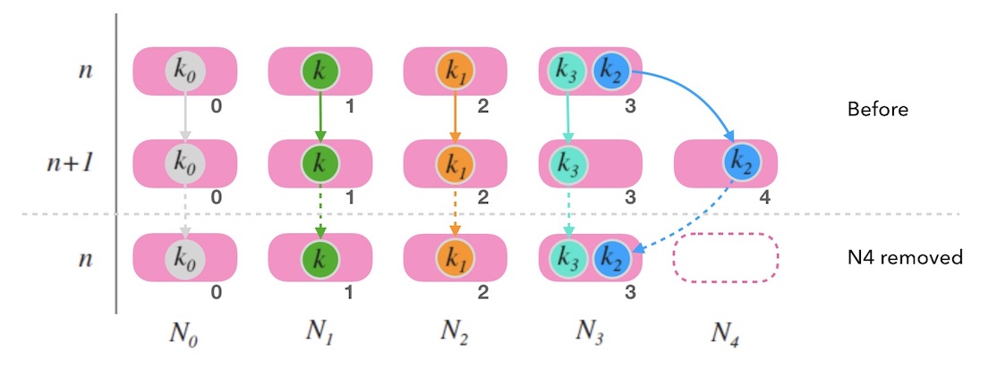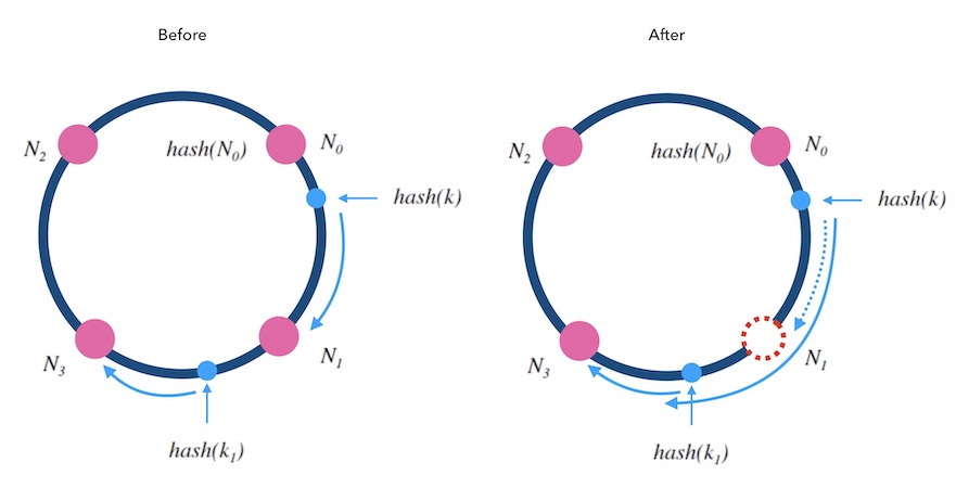 对于删除一个节点的情况,也是类似的, 同样会导致新映射和老映射的不一致。 从下面图3.2中可以看到, 原本映射到 N2 的 k 在缩容后映射到了 N0, 也是不一致的:
